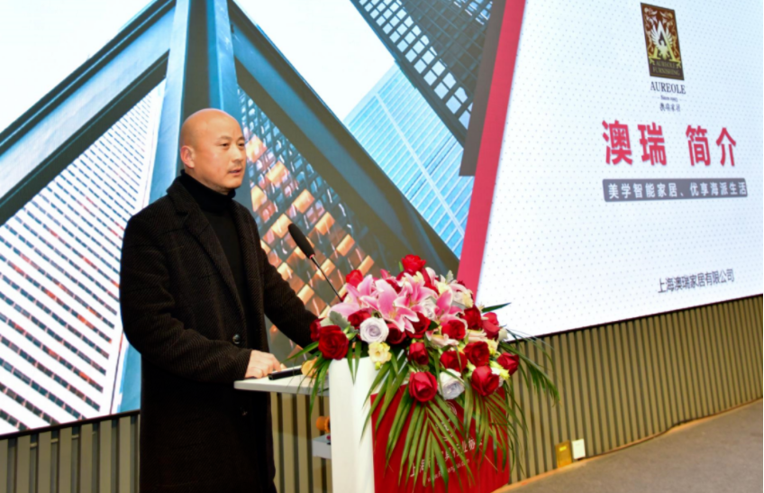 上海澳瑞家居有限公司董事长高中华做企业介绍。秉承对绿色环保健康理念的追求,澳瑞成功打造领先国际技术的蓝光LDE光固化水性漆家具漆涂生产流水线,实现有害物质零排放,在家具行业起到了标杆指导作用。