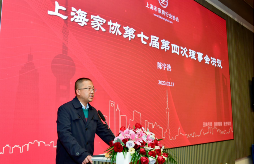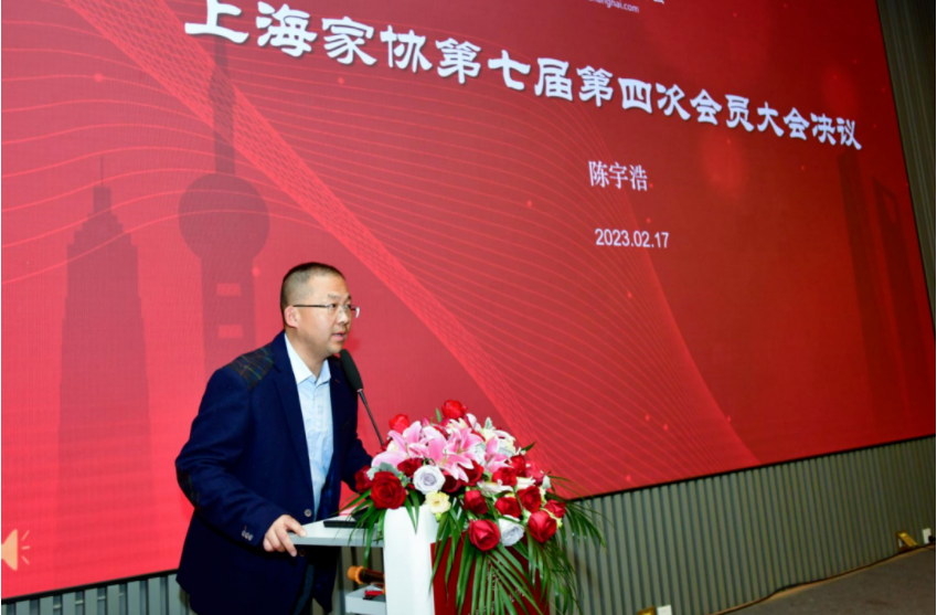 上海家协综合部主任陈宇浩宣读了上海市家具行业协会第七届第四次理事大会决议,圆满的完成了上半场理事大会议程。