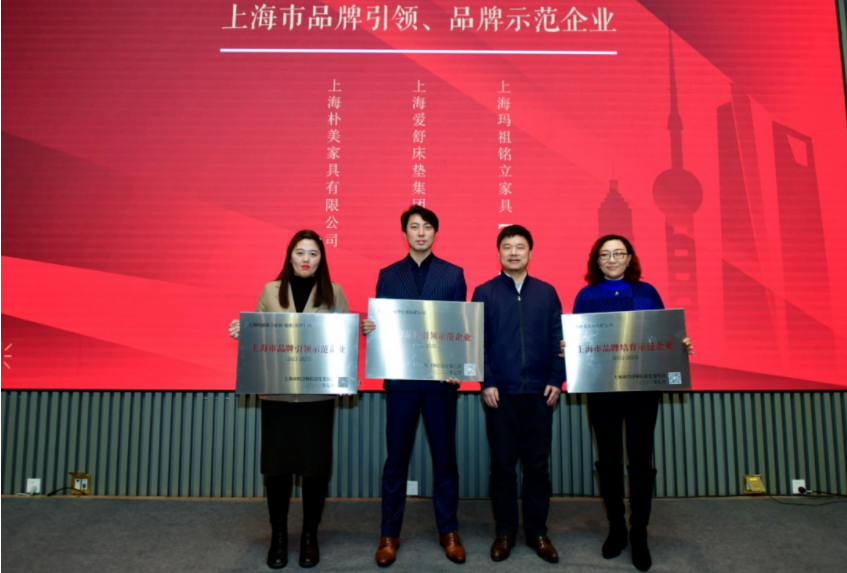 上海玛祖铭立家具(集团)有限公司、上海爱舒床垫集团有限公司荣获”上海市品牌引领示范企业“荣誉称号,上海朴美家具有限公司荣获”上海市品牌培育示范企业“荣誉称号。 上海市经信委都市产业处副处长陈建林为企业颁牌。