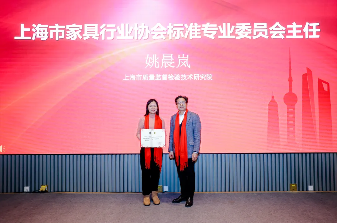 上海市家具行业协会会长高伟为上海市家具行业协会标准专业委员会主任,上海市质量监督检验技术研究院姚晨岚颁发聘书。