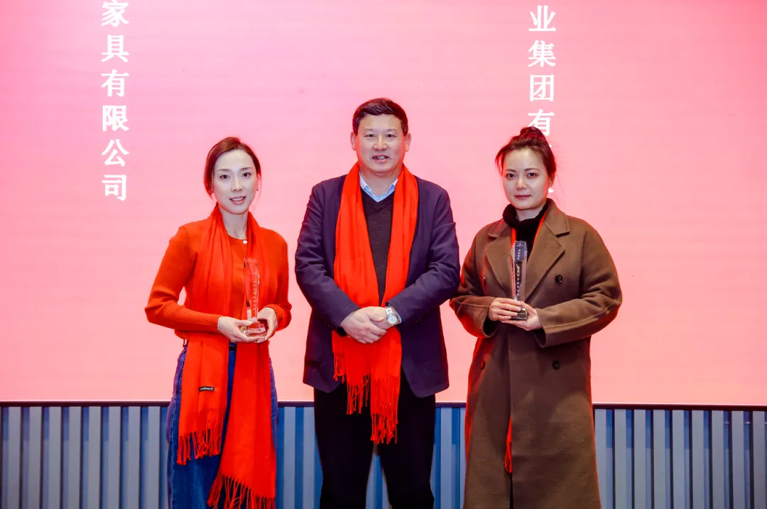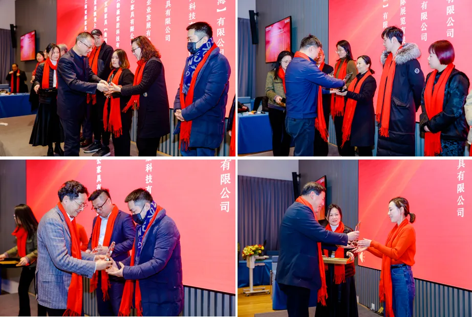 上海市家具行业协会会长高伟为荣获上海家协“爱心奉献奖”企业:雅轩家具、美勒森家居、美稷家具颁发奖杯。