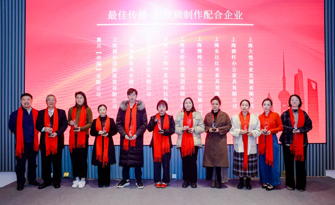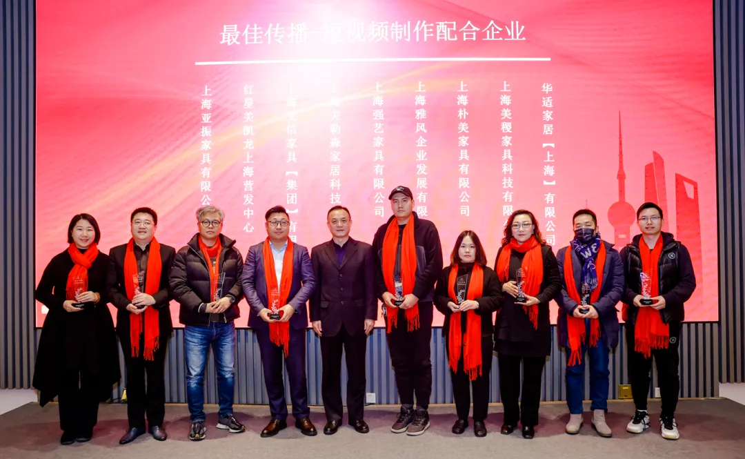 上海市都市产业处副处长陈建林为荣获上海家协“最佳传播奖”企业:震旦家具、博华展览、莘潮家居、龙凤家居、诺梵家具、爱舒床垫、雅特兰家具、东达红木、雅轩家具、大悦实业颁发奖杯。