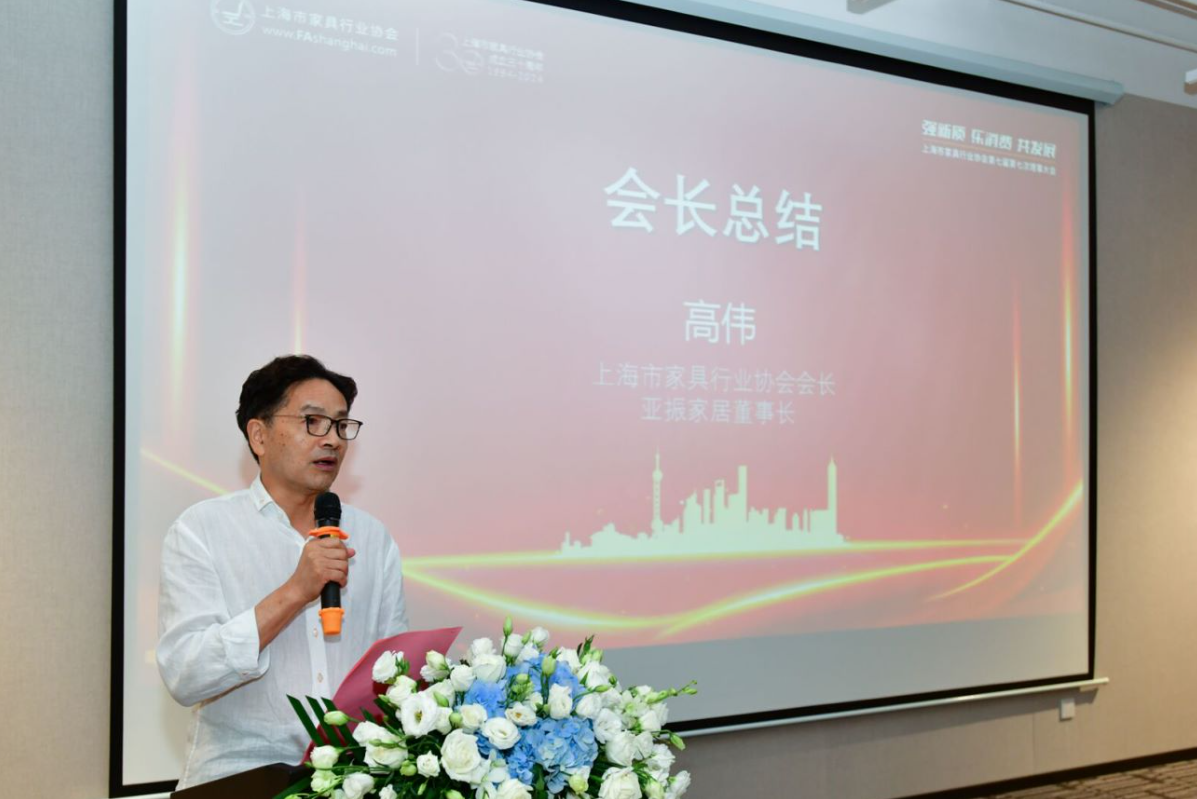 会议最后,上海家协会长高伟做了总结发言,强调了企业利用协会平台价值的重要性,并关注企业出海、设计创新和人才培训等关键话题。落实执行“以旧换新、消费补贴”政策,提振消费市场,共同为上海家协成立30周年写下辉煌的一章。