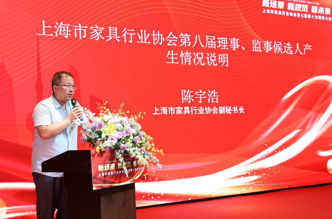 上海家协信息部主任刘俊宏向大会介绍了上海市家具行业协会第八届会费收取标准和管理办法。基于行业趋势变化与服务升级需求,对2020年制定的标准进行合理调整。新标准获审议通过。为确保换届选举工作的顺利开展,秘书长助理张思文宣读了《第八届换届选举总监票人、监票人产生情况说明及名单》,并通过审议。随后又介绍了《第八届理事、监事选举办法》,确保换届选举过程合法合规。副秘书长陈宇浩通报了第八届理事、监事候选人产生情况说明,并宣读候选人名单。候选人由广泛推荐、严格筛选产生,涵盖行业内具有代表性与影响力的企业负责人,最终名单经大会审议通过。上海市家具行业协会会长高伟做大会总结。他表示,在全体家具人的共同努力下,设计创新与绿色环保已成为上海家具企业的必修课。他呼吁行业在新经济、新市场、新规范下,积极借鉴国际先进理念,为未来发展做好充分准备。并强调,本次理事会是一次承上启下的重要会议,不仅完成了对现有工作的总结与改进,也为第八届理事会顺利换届铺平了道路。最后,副秘书长陈宇浩宣读本次理事会会议决议。标志着上海市家具行业协会第七届十次理事会圆满完成各项议程,为第八届理事会换届选举的顺利推进提供了坚实保障。