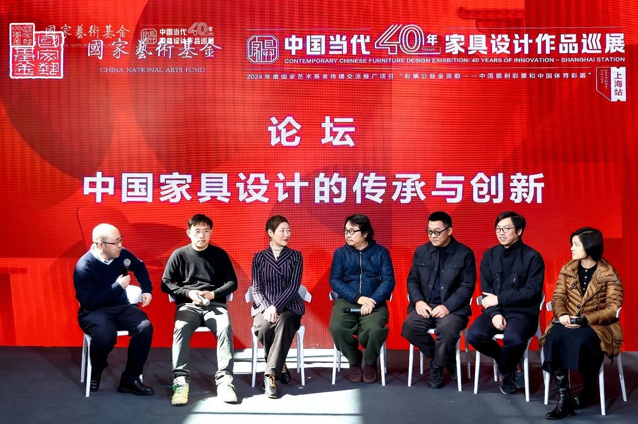 上海市家具行业协会秘书长李霞女士在致辞中表示:设计是家具产业的灵魂,是推动行业转型升级的重要保障。上海作为设计之都、时尚之都、品牌之都,汇聚了众多优秀国际家具品牌和中国原创设计家具品牌,始终以开放包容的姿态推动行业创新。上海家协通过协会各专委会推动设计、智能制造与绿色低碳发展,并持续深化校企合作。中南林作为家具设计领域重要学府,为家具行业输送了大量优秀人才,上海家协曾多次携企业到中南林大学进行招聘和产、学、研对接,并取得满意的成果。上海家协将继续加强与各方的合作与交流,深化校企合作,加强人才培养,推动技术创新,以满足市场的多元化需求。 上海大悦实业发展有限公司总经理侯正光先生、千年舟新材科技集团股份有限公司品牌总监梁坚先生、中南林业科技大学家居与艺术设计学院副院长兼策展人黄艳丽教授分别致辞,上海市浦东新区文化艺术指导中心专职副书记毕震钧先生宣布开幕。开幕式后,黄艳丽教授主持了“中国家具设计的传承与创新”的论坛,李霞、侯正光、张周捷、沈法、章彰、吴春茂等嘉宾分享了他们的设计理念、创作心得及对未来家具设计趋势的独到见解。从左至右:黄艳丽、张周捷、李霞、侯正光、沈法、吴春茂、章彰 本次展览涵盖了家具、陈设、雕塑、装置、影像等多种艺术形式,通过多元化的视角,呈现了不同时代背景下的设计思潮与创作流派,诠释了传统与现代、东方与西方、形式与功能的完美融合。