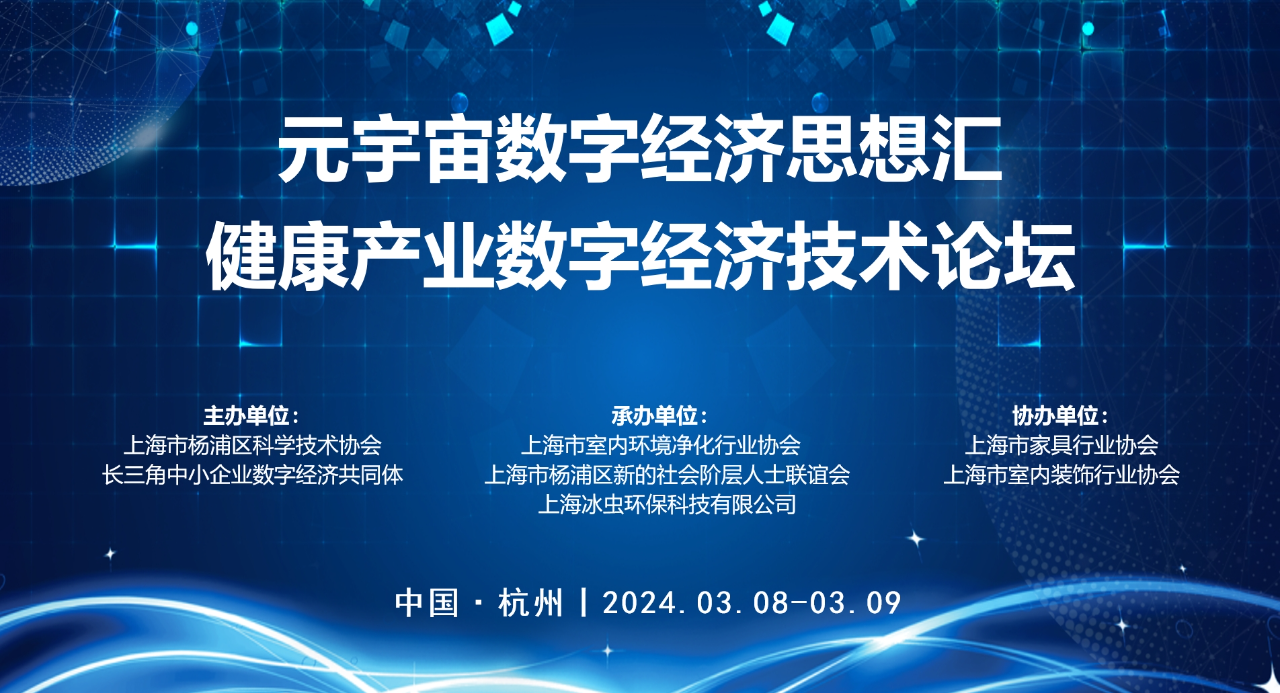 3月8日-9日,“元宇宙数字经济思想汇健康产业数字经济技术论坛”活动在浙江杭州举办。本次活动由上海市杨浦区科学技术协会、长三角中小企业数字经济共同体主办,上海市室内环境净化行业协会、上海市杨浦区新的社会阶层人士联谊会、上海冰虫环保科技有限公司承办,上海市家具行业协会、上海市室内装饰行业协会协办。