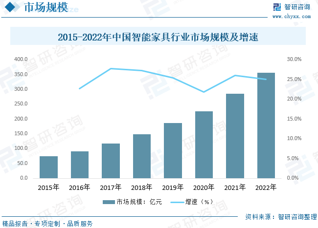 中国智能家具产业是随着互联网技术的发展而发展的,智能家居的融合演变期尤为明显。就国内智能家具行业市场规模而言,国内智能家具市场规模逐年增长,且持续保持较快的增速,数据显示,2022年中国智能家具行业市场规模达到356.72亿元,同比增长25.09%。