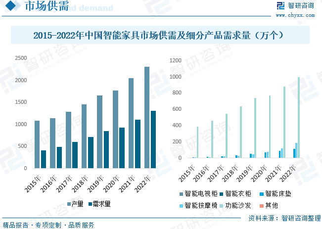 市场供需方面,国内智能家具行业产量远大于需求量,出口需求迫切。数据显示,2022年中国智能家具行业产量和需求量分别为2316.6、1315.1万个,分别同比增长12.7%、18.7%。细分产品方面,智能家具产品种类众多,目前主要以部分功能性较强的家具为主,主要包括功能沙发,智能按摩椅,智能床垫等等产品。2022年智能家具高端产品如智能电视柜、智能衣柜需求量分别为3.45、2.93万个,中端产品智能床垫及智能按摩椅需求量分别为117.7、185.9万个,大众商品如功能沙发需求量为999.8万个,其他智能家具需求量约为5.31万个。