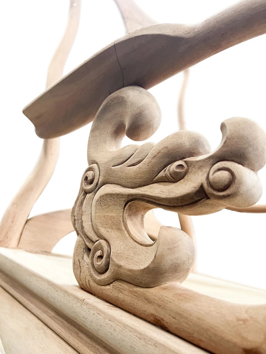 以木为纸,以刀为笔,以匠心赋艺术以灵魂。以数十年工艺大师潜心雕琢,耗费几十乃至上百工时,方成就一件艺术臻品。两侧扶手的龙头威武挺拔,祥云飘渺流转,龙威势不可挡,给人以无穷的力量和希望;四足以兽腿设计,暗示着神兽之力,以此承载着美好憧憬;椅枨雕刻以“双龙戏珠”,寓意吉祥如意。尤其是椅子背部的龙尾部分,通过精湛的雕刻,巧妙的设计,呈现出龙的蜿蜒,更富张力。