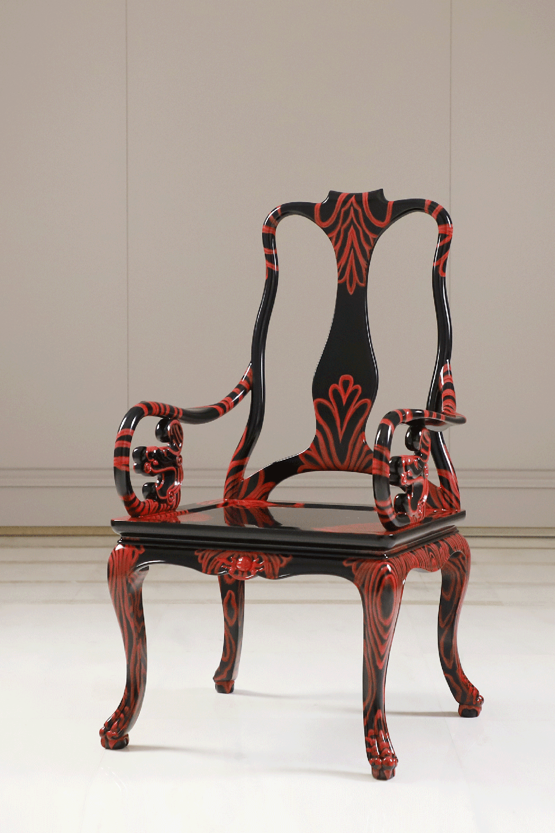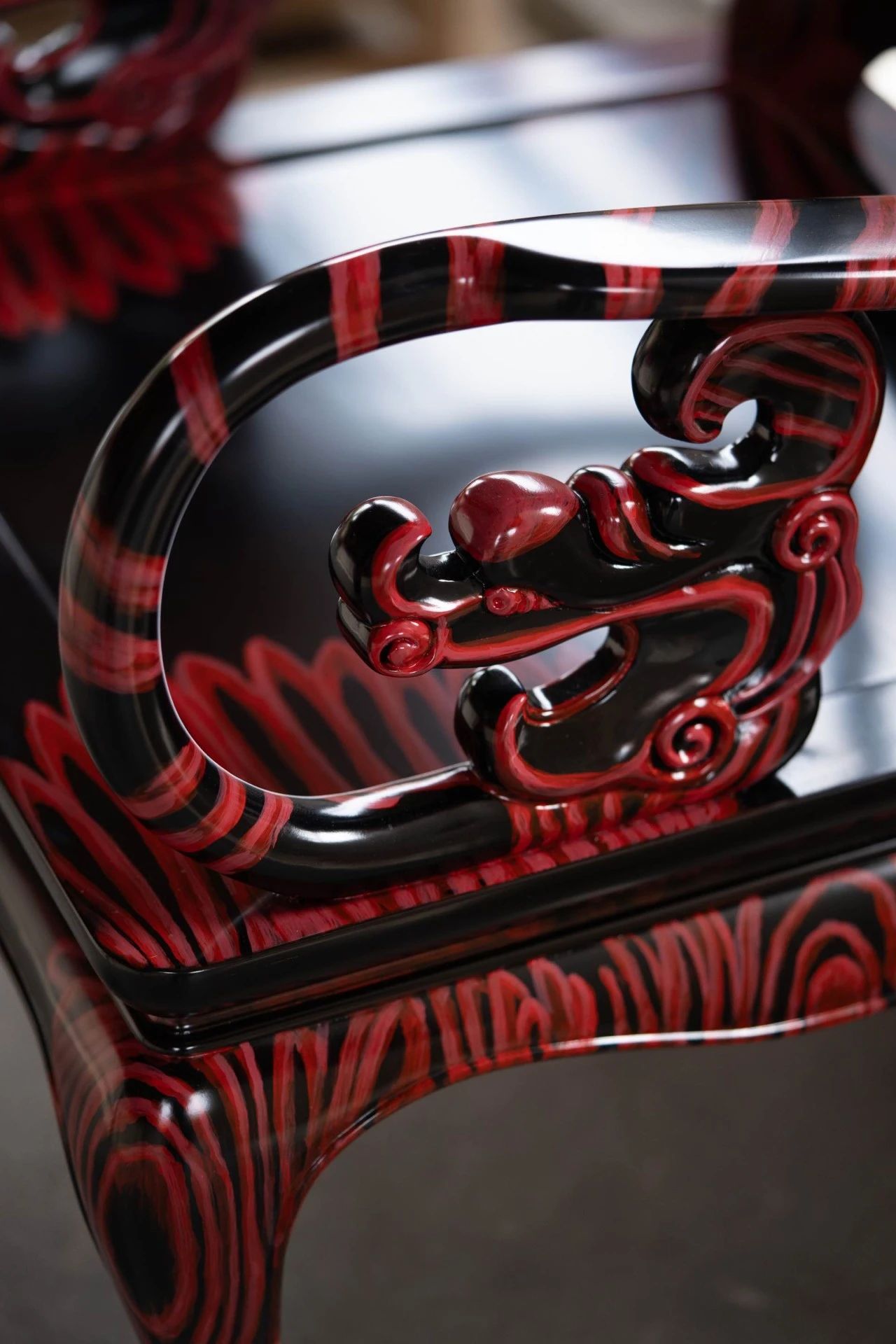 初心勾线,匠心施彩。为了使产品色泽更加丰润饱满,每道涂装遵循“8小时,25度”的严苛工艺标准,加固着色,提升产品色泽的丰富度与颜色的层次感。技艺精湛的手绘工艺师在特殊定制产品方面有着独到工艺,他们注重每一个花饰的细微变化,以卓绝巧手绘出优雅繁复的纹饰。黑底红色抽象纹理的漆面处理,展现了漆画的精湛技艺。黑底如同夜空的深邃,与龙的神秘气质相契合,而红色的花卉纹样如涟漪般晕染开来,运用抽象艺术表现形式,让图案自然地流动和融入彼此之中,象征着花开富贵,瑞彩万里。